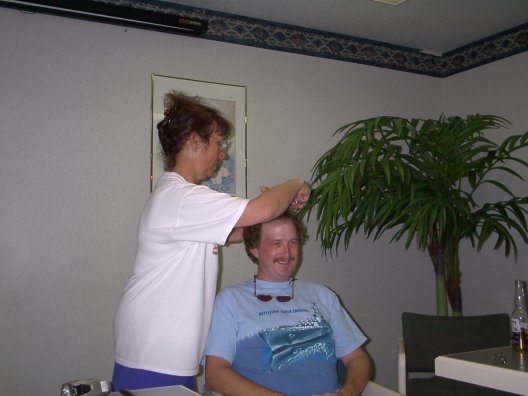 Emily, Fred, Joe, Neil, John, and Suzanne, watching Barb cutting