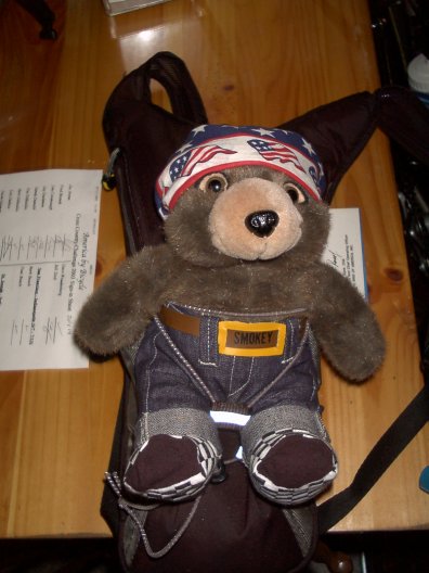 Smokey rides on Julie's Camelback.