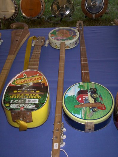 Banjos made from cookie tins and a ham tin.